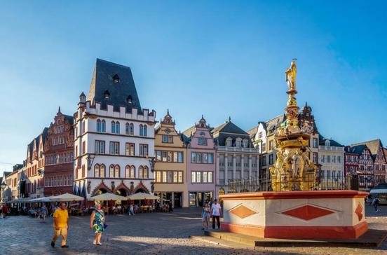 Das Kopfsteinpflaster des quirligen Platzes ist nichts für Highheels. Aber in den unzähligen großen und kleinen Geschäften drumherum kannst du Highheels kaufen und vieles andere, an den Marktständen auch frische Blumen, Obst und Gemüse. Der Hauptmarkt ist das Shoppingzentrum der Stadt und ein architektonisches Kleinod. Von hier aus hast du einen schönen Blick auf die Porta Nigra und den Dom. Flankiert wird der Platz von der barocken Stadtkirche St. Gangolf und prächtigen Bürgerhäusern wie der Steipe. Auf den Steinstufen zum reich verzierten Marktbrunnen sitzen Jugendliche bis in die Nacht, ältere Semester bevölkern die Straßencafés ringsum.