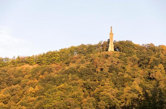 Sehen und gesehen werden einmal anders: Die 1866 geweihte Mariensäule auf dem Markusberg, dem höchsten Punkt der Sandsteinfelsen am Eifelufer, ist weithin sichtbar und zu Fuß von der Katholischen Akademie aus erreichbar (ca. 1 km). Auf dem Vorplatz des 40 m hohen sakralen Denkmals hast du einen spektakulären Blick auf Trier und das Moseltal. Die Säule ist ein Akt des Trotzes gegen die damalige preußisch-protestantische Regierung: Die katholischen Bürger wollten mit ihr das Dogma der Unbefleckten Empfängnis unterstreichen.
