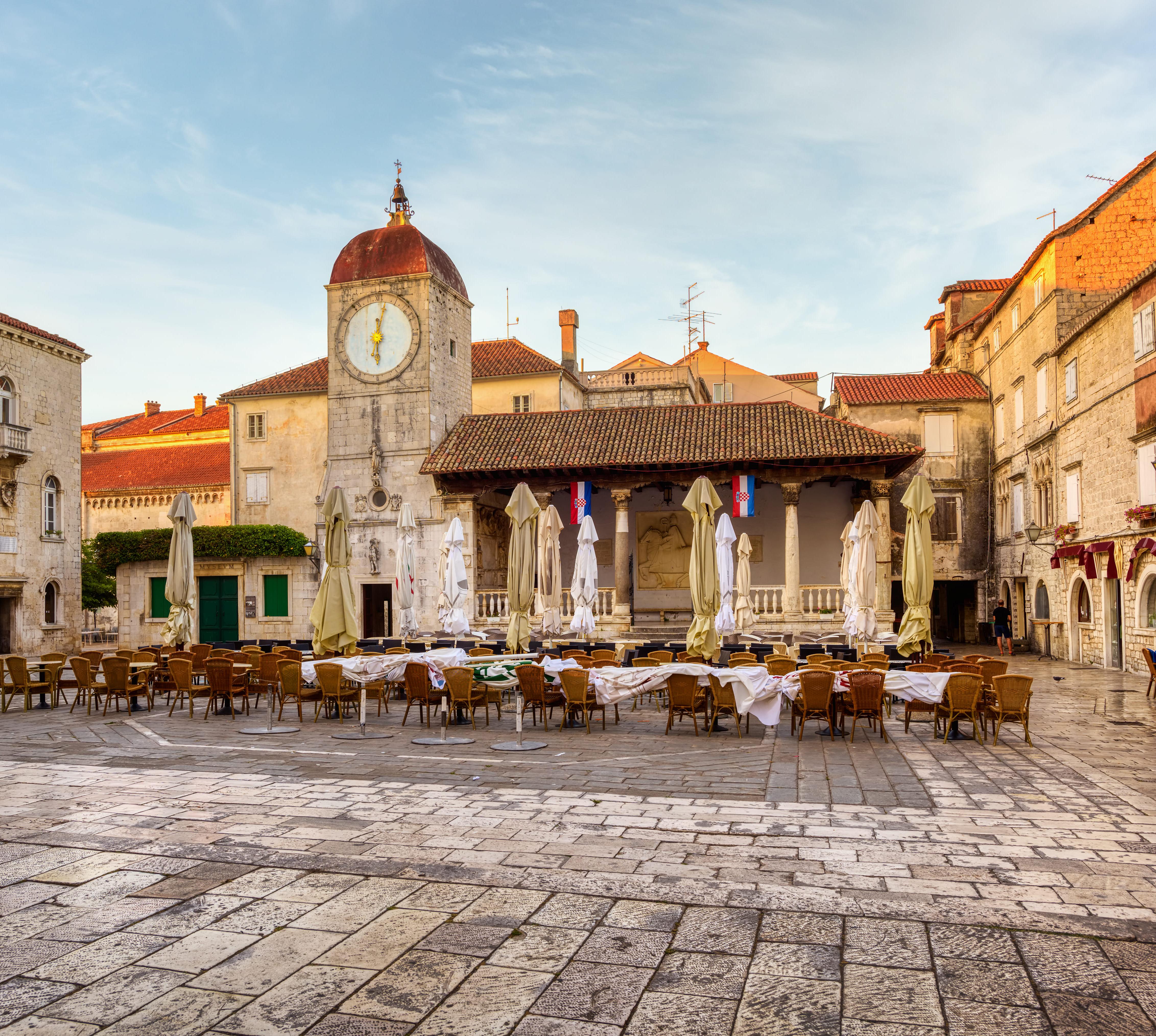 Romanik und Gotik haben in keiner anderen dalmatinischen Stadt die Jahrhunderte so gut überdauert wie in Trogir. Bereits im 3.Jh. v.Chr. gründeten griechische Kolonisten die Siedlung Tragurion auf einer länglichen Insel, die sich zwischen das Festland und das weitaus größere Eiland Ciovo schmiegt. Heute drängen sich darauf Kirchen, Paläste und Bürgerhäuser entlang schmaler Gassen. An Fassaden und in Innenhöfen sind architektonische Details wie Biforienfenster, Arkadenbögen und Brunnen von der Formensprache des 13.bis 15.Jhs. geprägt. Dabei ist Trogir keine museale Stadt, denn Einheimische wie Feriengäste bringen Leben in die von der UNESCO geadelten historischen Mauern. Zwei Brücken verbinden den Altstadtkern mit den modernen Vierteln im Süden und Norden.
