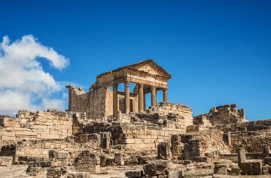 In Dougga sind die römischen Ruinen von Thugga sehenswert. Malerisch auf einem Hügel zwischen Olivenbäumen ausgebreitet, zählt die von der Unesco geschützte Stätte zu den bedeutendsten Orten Nordafrikas: Theater und Kapitolstempel aus dem 2.Jh. sind hervorragend erhalten. Der mondsichelförmige Tempel der Juno Caelestis (3.Jh.) lässt karthagische Einflüsse im Kult erkennen. In den Winterthermen aus dem 3.Jh. entspannten sich die Herren nach dem Besuch des gegenüberliegenden Bordells: Dessen Eingang schmückten mit Brüsten und Penissen dekorierte Hinweisschilder. Sie wurden vor einigen Jahren aus Schamgefühl entfernt.