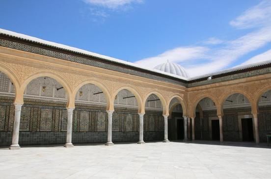 Im 8.Jh. entstand ein erstes Gotteshaus, das mehrmals umgebaut wurde. Ab dem 13.Jh. avancierten die Zitouna und die ihr angeschlossenen Lehranstalten, die Medresen, zur bedeutendsten Hochschule des Landes und zur drittwichtigsten der islamischen Welt. Neben Theologie wurden Philosophie, Astronomie und Medizin unterrichtet. Heute ist die Ausbildung der Studenten an die Universität von Tunis verlagert. 184 von antiken Kapitellen aus Karthago gekrönte Säulen gliedern den Gebetssaal. Nichtmuslimen ist der Zutritt untersagt, sie können allerdings vom Innenhof aus einen Blick auf den im Dämmerlicht liegenden Raum erhaschen. Sehenswert ist das schöne Vierkantminarett mit Stuck- und Majolikadekor.