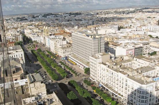 Vorbei an alten französischen Häusern, dem Theater (Ecke Rue de la Grèce) und zahllosen Cafés geht es vom Uhrenturm unter Platanen hindurch einmal quer die 900 m durch die Neustadt Richtung Medina. Der Gelehrte Ibn Khaldoun (1332–1406) bewacht von seinem Denkmal aus den Platz vor der Kathedrale. Hier verengt sich die Avenue Bourguiba zur Avenue de la France und endet am Medinator Bab el-Bahr. Von der Terrasse im Hotel El Hana International hat man einen super Blick auf die Neu- und Altstadt.