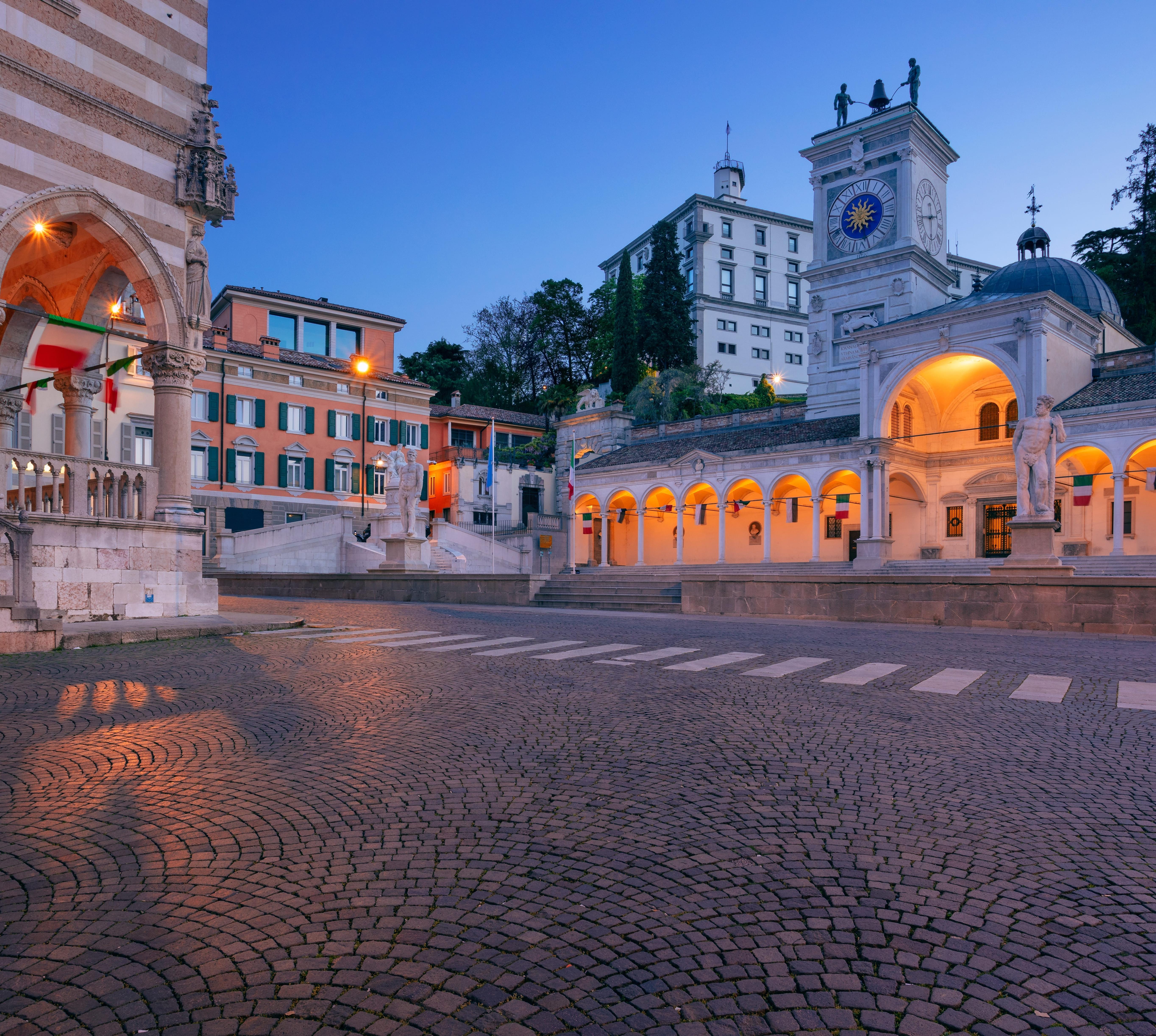 Dank seines harmonischen Gefüges aus unterschiedlichen Elementen – Palazzi, Stufen, Statuen, die Loggia del Lionello und im Hintergrund das Kastell – wird der „Freiheitsplatz“ als schönster venezianischer Platz auf dem Festland gerühmt. Diesen einladenden Mittelpunkt der Stadt akzentuieren die hochelegante, rosa-weiß gestreifte Loggia del Lionello, das einstige Rathaus in typisch venezianischer Gotik, und der vom Uhrturm beherrschte Porticato San Giovanni, der den Platz mit seinem langen Renaissanceportikus auf schlanken, feinen Säulen säumt. Hinter der Loggia del Lionello beginnen die lebhaften Straßen Via Rialto und Via Mercato Vecchio, die an stattlichen Palazzi vorbei durch die Altstadt führen und zum Bummeln einladen.
