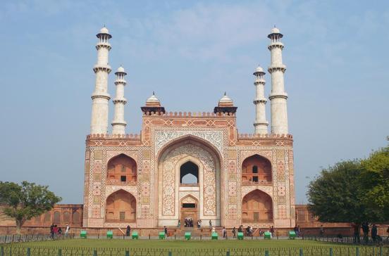 Das Mausoleum Akbars des Großen wurde in feierlicher Mogul-Architektur in einem großzügigen Parkgelände errichtet. Die Untergeschosse sind aus rotem Stein gemauert, das Obergeschoss ist eine harmonische Marmorarbeit. Achtung: freche Affen!