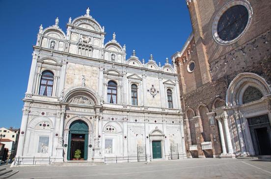 Die Bruderschaft der Slavonier wurde 1452 von reichen dalmatinischen Kaufleuten zu dem Zweck gegründet, alte, arme Seeleute aus ihrer Heimat zu unterstützen und deren Kinder erziehen zu lassen. Das kleine Oratorium ist einer der ganz wenigen Räume in der Stadt, dessen Malereien noch von den ursprünglichen geschnitzten und vergoldeten alten Wandverkleidungen umrahmt sind. Sein großer Schatz ist der Anfang des 16.Jhs. von Vittore Carpaccio geschaffene Gemäldezyklus. Er zeigt in der für den Maler typischen duftigen Eleganz Szenen aus dem Leben der drei dalmatinischen Schutzpatrone Georg, Trifon und Hieronymus.