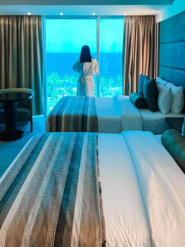 Alle Zimmer in der Unterkunft Hotel Villa Playa Grande sind eingerichtet mit einem Flachbild-TV mit Kabelkanälen und einem Safe. Die Gästezimmer haben einen Schreibtisch.