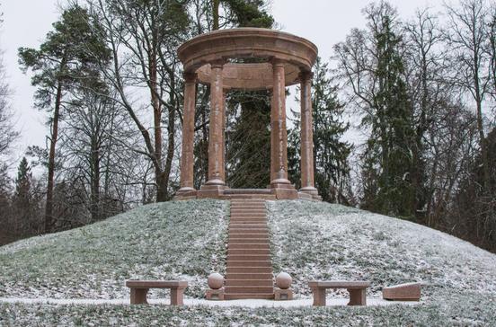 Graf von Vietinghoff, der den Park um 1790 anlegen ließ, war ein großer Verehrer der griechischen Mythologie. Man sieht’s: Hellenistisch geprägte Baukunst wie der Alexanderpavillon und der Äolstempel zieren die Anlage längs der Pils iela. Auch das 1831 erbaute Mausoleum der Familie Vietinghoff, ein runder Kuppelbau auf einem Granitsockel, blieb erhalten. Das Innere wurde in der Sowjetzeit allerdings verwüstet, die filigranen Stuckverzierungen der Wände sind großenteils zerstört.
