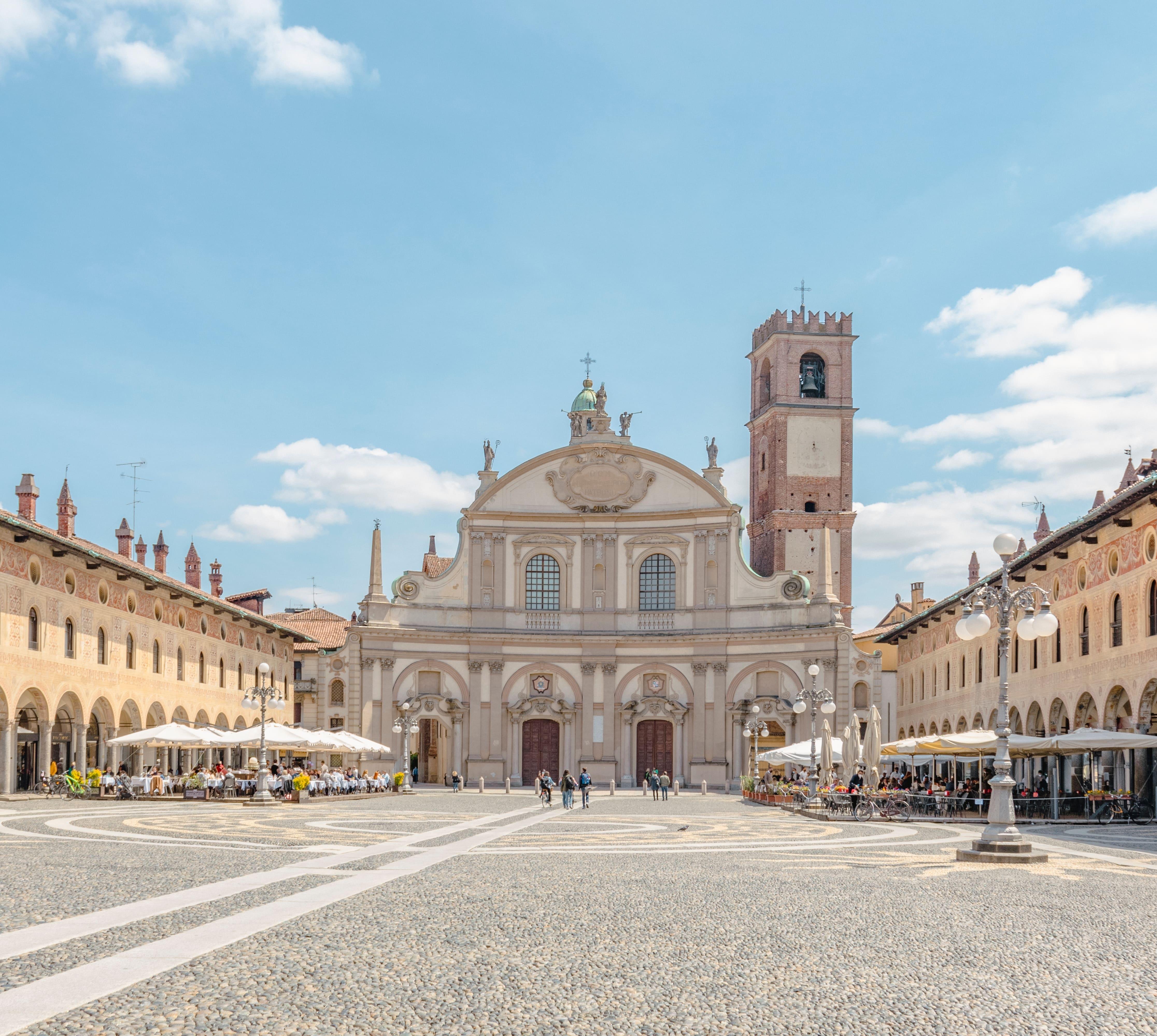 Die Piazza Ducale, ein 138 x 48 m großes Rechteck, ist einer der schönsten Plätze Italiens und der Renaissance, entstanden um 1494 im Auftrag des Mailänder Herzogs Ludovico il Moro direkt vor seiner Burganlage.