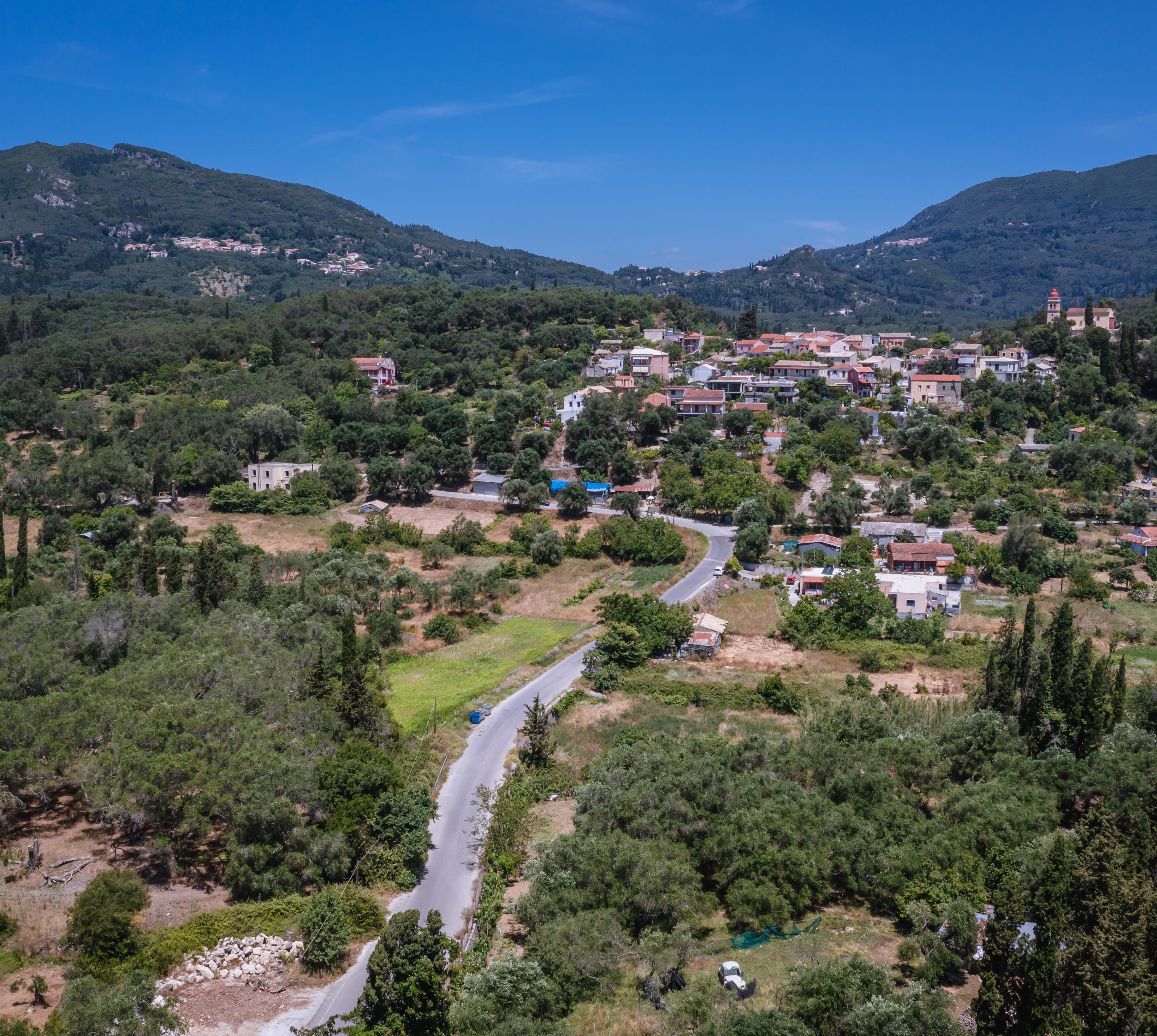 Das große Bergdorf liegt in einem besonders grünen Hochtal ohne Blick aufs Meer. Die meisten Bewohner leben vom Olivenanbau. Eine nur mit Jeeps befahrbare Piste führt zum 5 km entfernten, nicht mehr bewohnten Kloster Pantokrátoras hinauf.