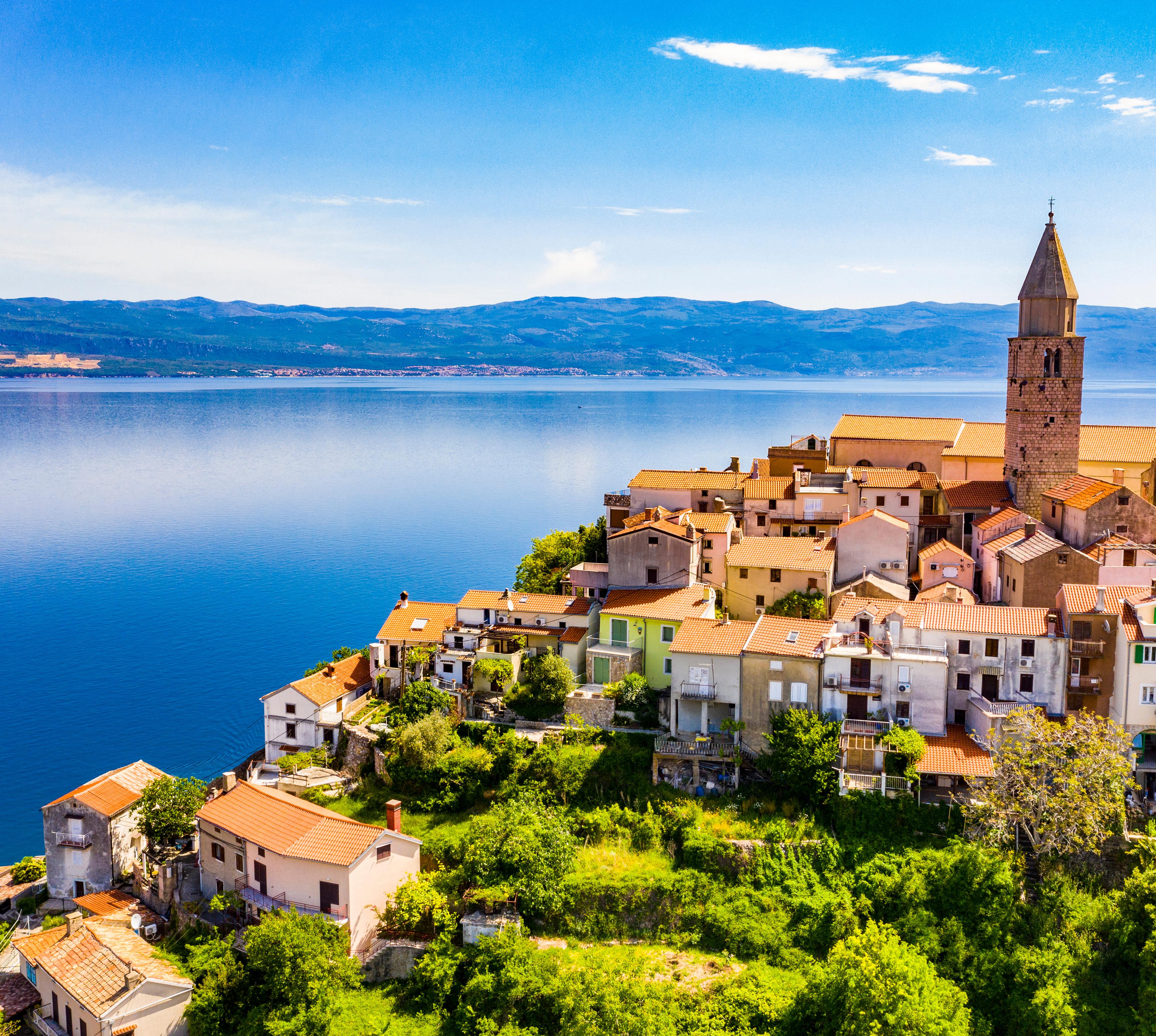 Kopfsteinpflaster, Oleander und Geranien als Schmuck an Fenstern und Türen, hier ein Torbogen, der in einen lauschigen Innenhof führt, dort eine steile Treppe zur nächsthöheren Gasse - Vrbnik wirkt dank seiner Lage auf einem 50 m hohen Fels über dem Meer sehr pittoresk. Es ist die Weinhauptstadt von Krk, vielleicht sogar des Kvarner, denn der hier gekelterte Weißwein Vrbička Žlahtina gilt als einer der besten Kroatiens. Man kann ihn in verschiedenen Kellereien im Ort verkosten. Der Kiesstrand Potovošće südlich von Vrbnik zählt zu den reizvollsten Stränden der Kvarner-Inseln, denn das Wasser ist von einer atemberaubenden Klarheit.