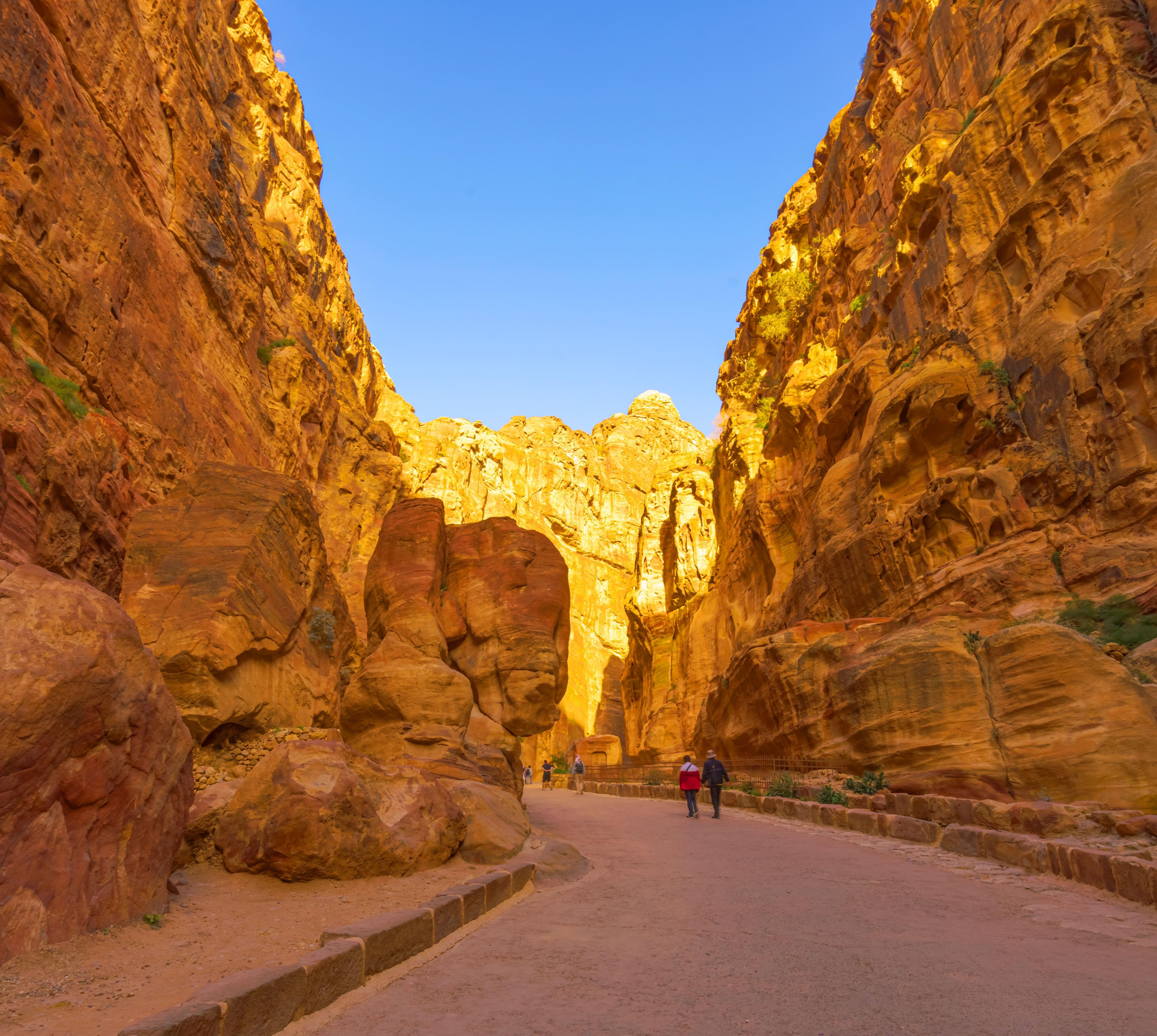 Die Felsenstadt Petra ist Höhepunkt jeder Jordanienreise. Der Sandstein, der von Violett, Rot, Rosa, Gelb, Beige und Braun leuchtet, die tiefen Schluchten und Wadis sind an sich schon beeindruckend. Die Nabatäer haben ihre großartige Architektur in harmonischen Einklang mit dieser Natur gebracht: In den rosaroten Fels meißelten sie die Fassaden ihrer Tempel, Schatzkammern, Häuser und Gräber. Etwa 800 Monumente sind in Petra und Umgebung erhalten. Der Eingang zur Felsenstadt liegt im Dorf Wādī Mussa. Seit 2007 ist Petra eines der sieben "neuen Weltwunder". Die Initiative aus der Schweiz ist zwar wissenschaftlich nicht unumstritten, doch in Jordanien ist man sehr stolz auf die Auszeichnung.