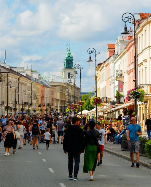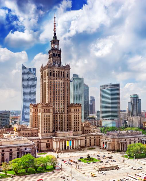 Da ist die kleine Altstadt mit ihren malerischen Gassen und den schönen Kaufmannshäusern, umgeben vom Beton sozialistischer Plattenbauten, von spiegelverglasten Wolkenkratzern und riesigen Einkaufszentren. Kirchen in katholisch-barocker Pracht zeugen von vergangenen Epochen. Aber alles wird immer noch überragt vom Kulturpalast – einst verhasstes Symbol des Stalinismus, heute Wahrzeichen der Stadt. Na ja, fast alles, denn seit 2025 schaut der Varso Tower als höchstes Gebäude der EU noch mit Kopf und Schultern darüber hinaus.