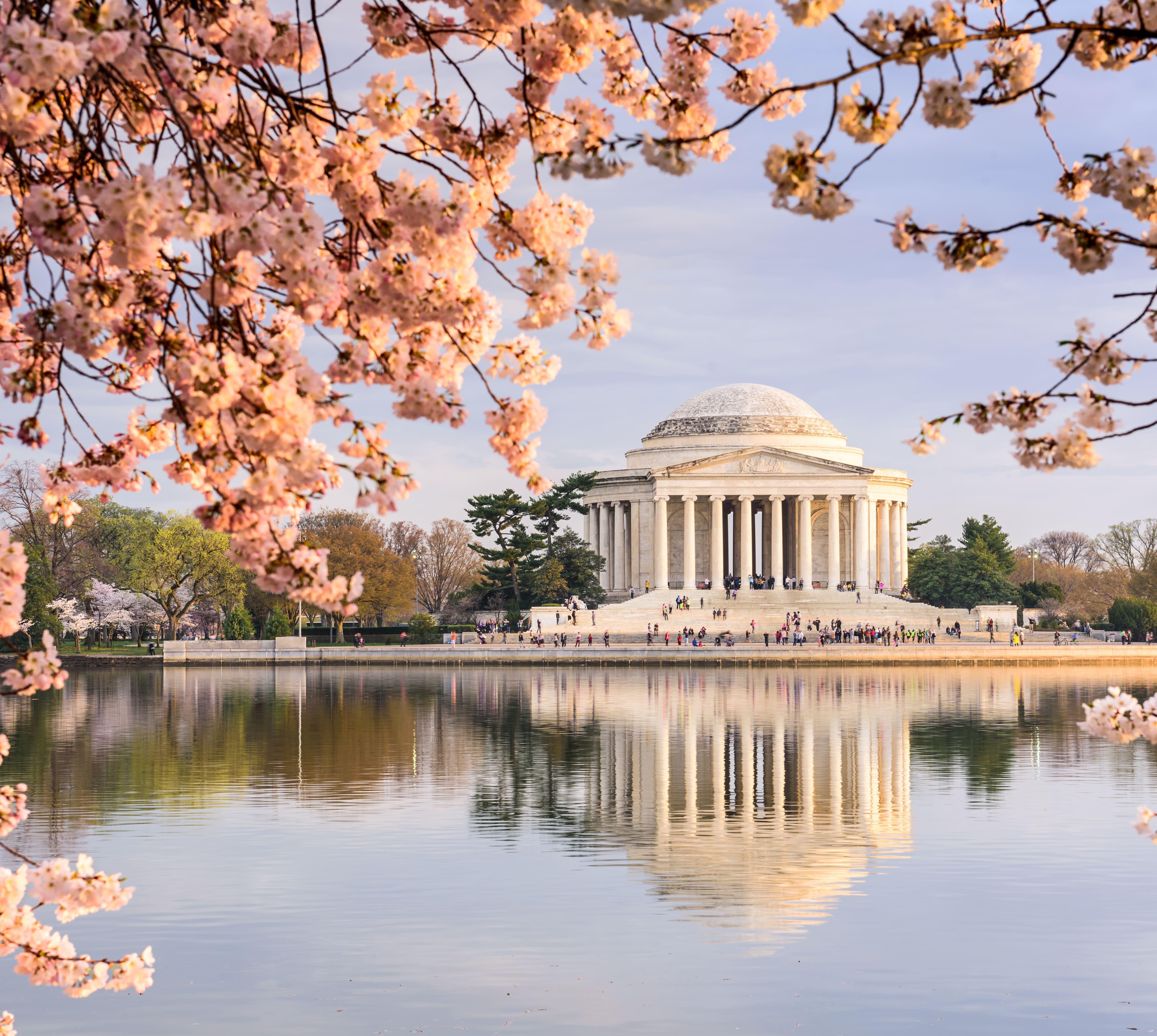 Der Kuppelbau, dem römischen Pantheon nachempfunden und 1943 fertig gestellt, thront über dem Tidal Bassin und erinnert an Thomas Jefferson (1743-1826), Verfasser der Unabhängigkeitserklärung und dritter Präsident der Vereinigten Staaten.