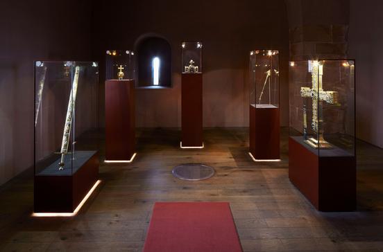 Zwischen 1088 und 1330 war die Reichsburg Trifels unter den Staufern und Saliern eines der wichtigsten Zentren der Macht. Hier wurden immer wieder die Reichsinsignien wie Krone, Zepter und Reichsapfel aufbewahrt. Nachbildungen können Sie heute in der spektakulär inszenierten Schatzkammer bestaunen.