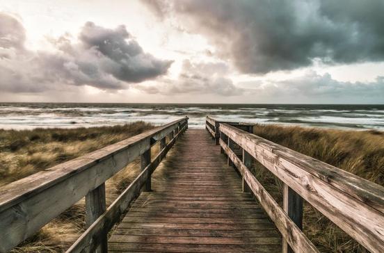 Ans Wasser gehts über eine imposante Treppenkonstruktion: 40 m lang, 10 m breit, 60 Stufen, mit Podesten zum Ausruhen, Treppenlift und – der Hammer! – einer 26 m langen Röhrenrutsche: Weiche Landung auf dem Hintern im Sand ist garantiert. Und damit kleine und große Kinder ihrem Vordermann nicht ins Kreuz krachen, gibts sogar eine Ampelanlage! Vor allem aber ist die Treppe stabil – und das ist auch nötig, denn regelmäßig werden Strand und Kliff bei Sturmfluten arg in Mitleidenschaft gezogen.