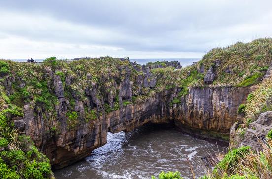 Diese Felsen, ausgehöhlt durch die starke Brandung, erinnern an aufeinander gestapelte Pfannkuchen - daher der Name Pancake Rocks. Sie sind Teil einer und 30 Mio. Jahre alte Erosionslandschaft.