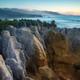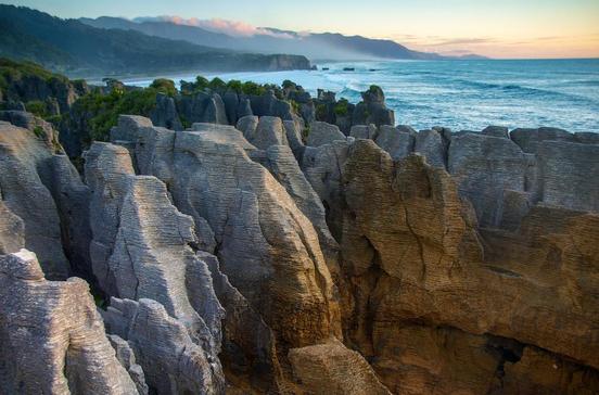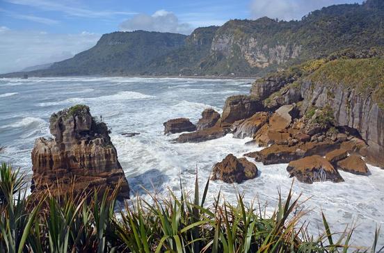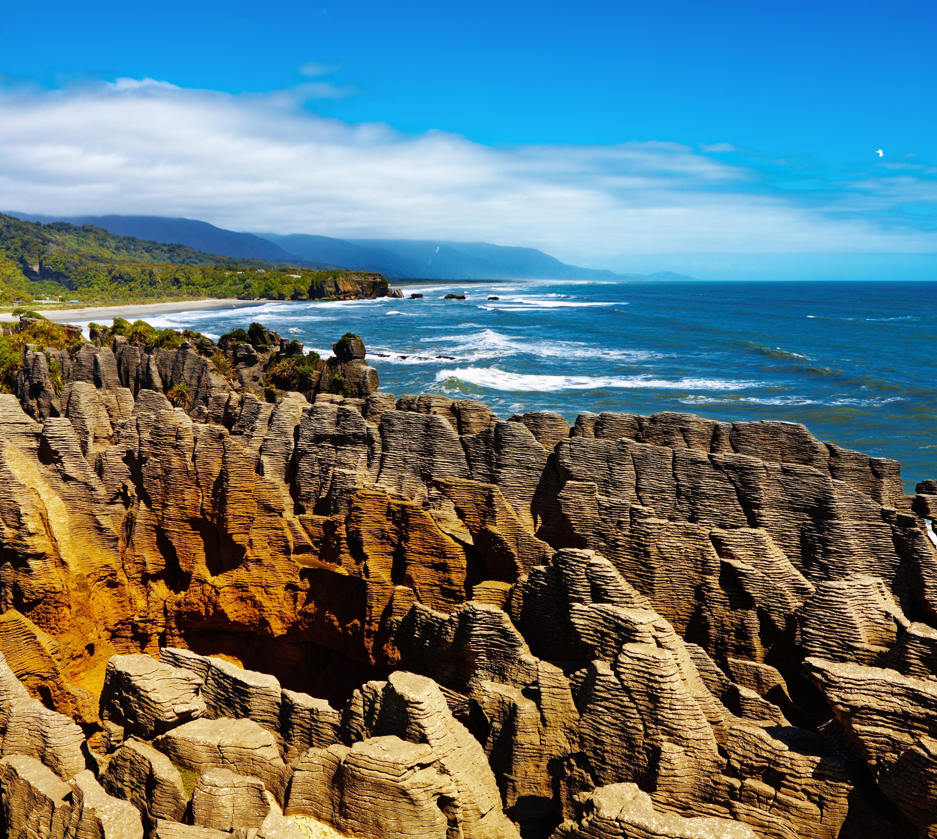 Eine rund 30 Mio. Jahre alte Erosionslandschaft befindet sich im Punakaiki and Paparoa National Park, deren Felsen an aufeinander gestapelte Pfannkuchen (Pancake Rocks) erinnern, ausgehöhlt durch die starke Brandung. Eine grandiose Kulisse.