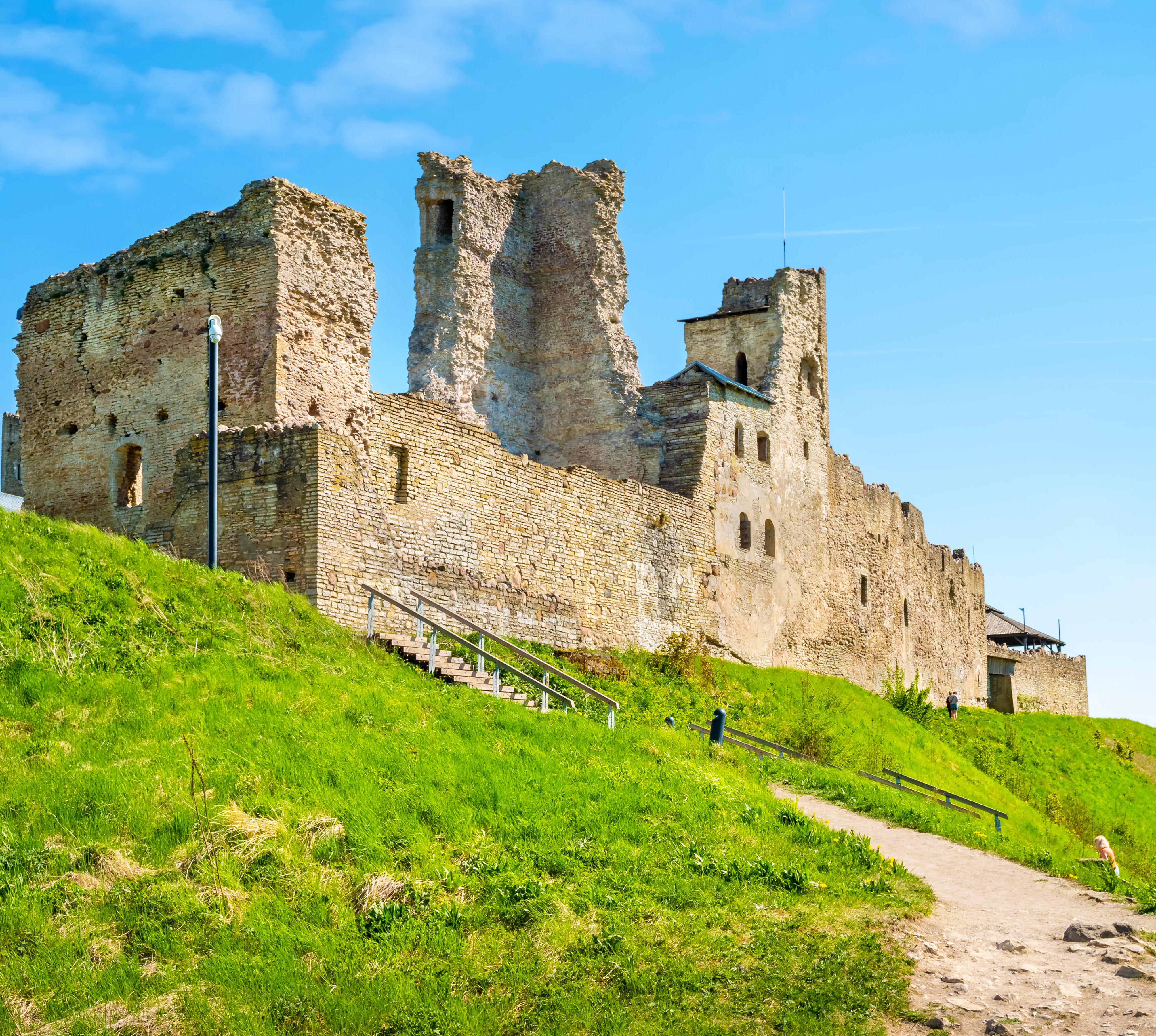 Die mächtige Ruine auf dem Wallberg mit ihren drei verbliebenen Türmen und dem riesigen Eingangstor wurde im 13.Jh. von den Dänen als Festunggegründet. Deutsche Ritter bauten sie um 1350 zur Ordensburg aus. Dänen, Deutsche, Schweden, Russen und Polen herrschten 400 Jahre in der Burg. Zu Beginn des 17.Jhs. wurde sie zerstört, ihre Mauern teils als Baumaterial abgetragen.