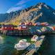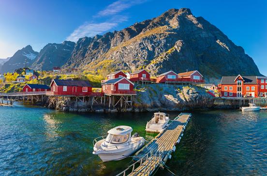 Die über 100 Jahre alten, rot-weiß gestrichenen Hütten dieser Fischersiedlung bilden einen fantastischen Kontrast zu den umliegenden Bergen.