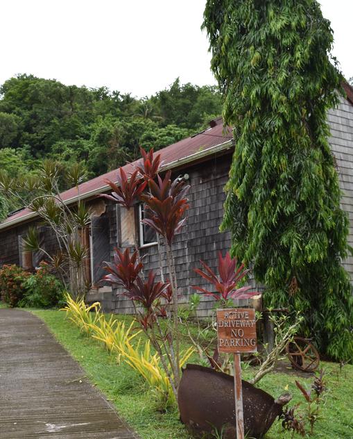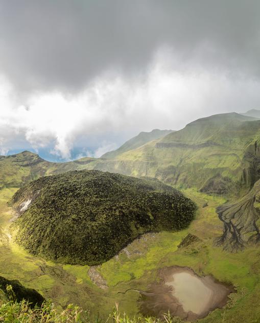 Der walisische Landschaftsgärtner Timothy Vaughn hat das einst heruntergekommene Stück Land in einen umwerfenden Garten mit tropischen Pflanzen und Vögeln verwandelt. Riesige Farnstauden bilden entlang der Wege einen schattenspendenden Baldachin. Im Hintergrund erhebt sich Grand Bon Homme, der 970 m hohe Berg der Insel.