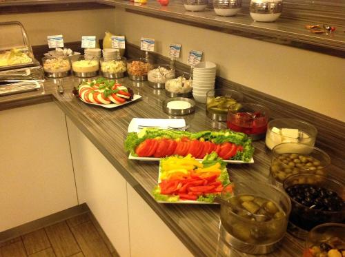 Ein Frühstücksbuffet wird im gemütlichen Restaurant des Cora mit Flachbild-TV und Terrasse serviert.