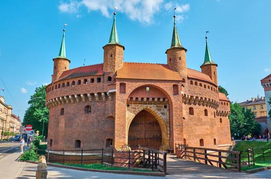 Krakau war im Mittelalter mit doppelten, bis zu 3 m breiten Mauern und 47 Wehrtürmen befestigt. Um diese Basteien kümmerten sich die jeweiligen Zünfte und lagerten dort auch teilweise ihre Waffen. Rund um die Mauern war ein tiefer Wassergraben angelegt, im 15.Jh. kam die Barbakane hinzu, eine runde Befestigungsanlage mit Planken und sieben schlanken Türmchen. Im 19.Jh., als in den meisten großen europäischen Städten die mittelalterlichen Wehranlagen abgerissen wurden, sollten auch in Krakau die Befestigungen abgetragen werden. Heute ist deshalb nur ein kleiner Teil der inneren Mauern mit zwei Basteien und dem Arsenal, der Barbakane und dem Haupteingangstor erhalten. Die Wehranlagen sind nur von außen zu besichtigen, aber man kann die Barbakane und die Mauern besteigen: Die höheren Etagen bieten eine interessante Aussicht.