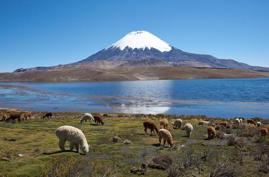 Die raue Schönheit des Altiplano erschließt sich am besten auf einer Rundfahrt durch die vier großen Schutzgebiete auf über 4000 m Höhe. Vom Parque Nacional Lauca führt eine Schotterpiste durch die endlose Weite, vorbei an einer Galerie stolzer Sechstausender und einsamen Dörfern mit schmucken Steinkirchen.