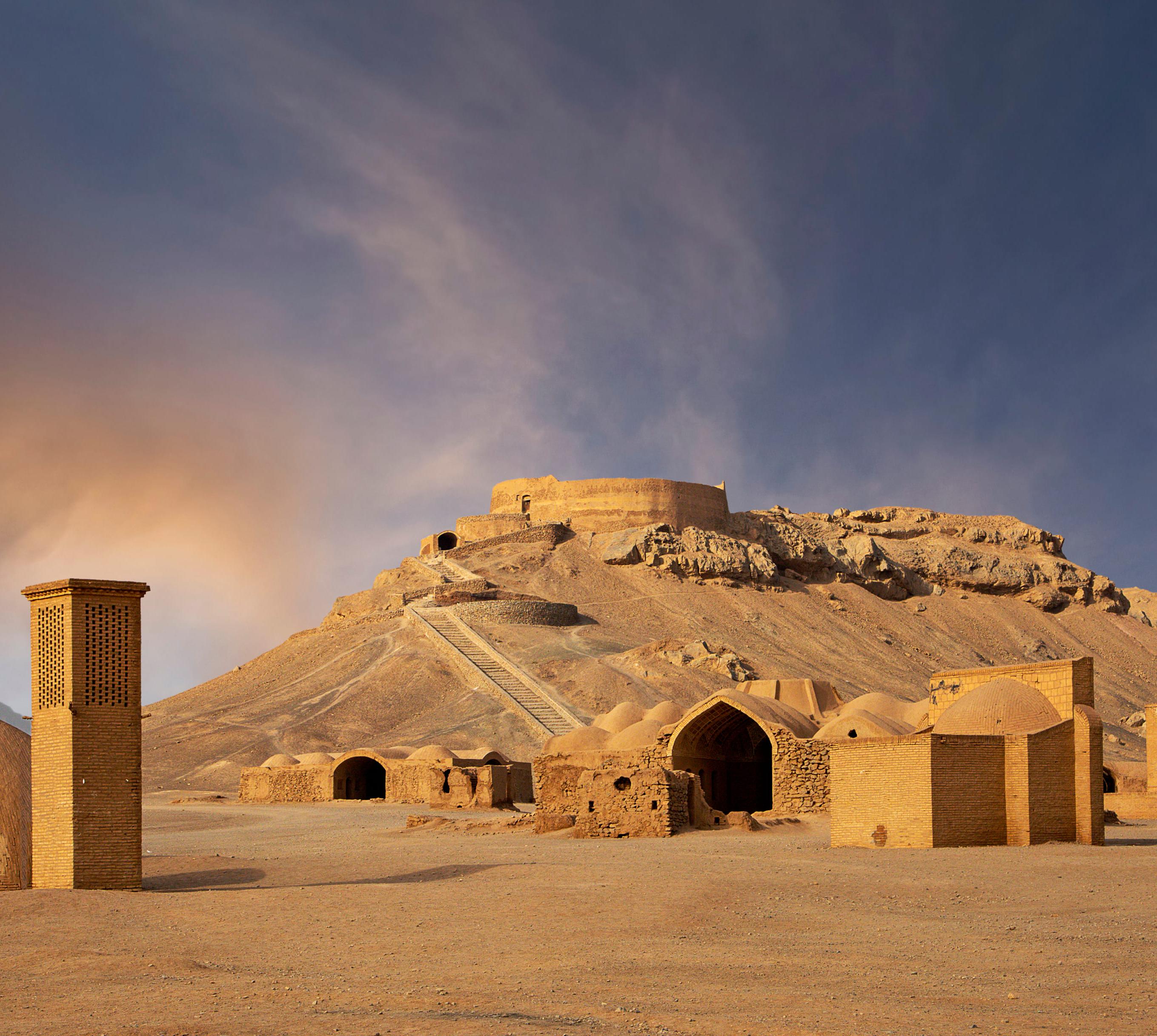 Makaber, aber ein Muss. Ähnlich den Tibetern pflegten Zoroastrier die Freiluftbestattung. Die Aufbahrungsterrassen sind längst außer Betrieb, ebenso die Kuppelbauten im Tal, wo man die Leichname, bevor man sie den Geiern überließ, in mehrtägigen Prozeduren gereinigt, balsamiert und verabschiedet hat. Der kurze, steile Aufstieg lohnt – wegen der schrägen, weihevollen Aura wie auch der Fernsicht auf die Stadt und die Viertausender-Zacken des „Löwengebirges“ (Shir Kuh).