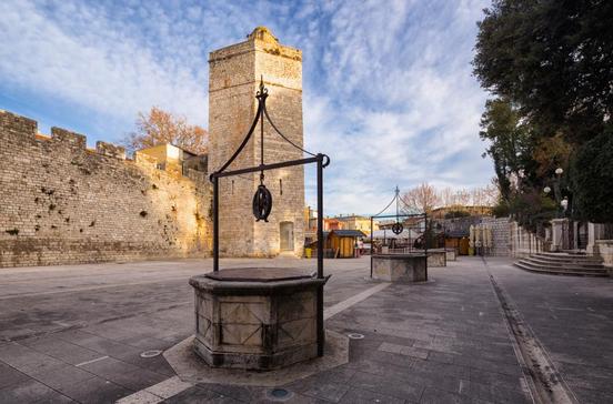 Hinter dem Landtor schmücken fünf Renaissancebrunnen diesen bezaubernden Platz, unter dem Zadars größte Zisterne Regenwasser auffing. Hier sind noch Teile der zinnenbewehrten, mittelalterlichen Stadtmauer mit Wachturm und zwei schöne Paläste aus dem 14./ 15.Jh. erhalten. Eine im Boden eingelassene Glasscheibe erlaubt den Blick auf römische Fundamente.