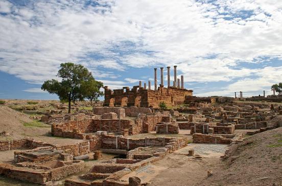 Die wiederaufgerichteten Säulen des Kapitolstempels von Thuburbo Majus zeugen von der römischen Vergangenheit. Bis Ende des 2.Jh. bestanden hier eine punische und eine römische Siedlung nebeneinander. Der Zusammenschluss brachte ein blühendes neues Gemeinwesen hervor, das bis ins 4.Jh. andauerte und großartige Bauten wie den Kapitolstempel sowie imposante Sommer- und Winterthermen hervorbrachte. Besonders idyllisch wirkt die Ruinenstätte im Frühsommer, wenn rote Mohnblüten die umliegenden Getreidefelder mit bunten Tupfern schmücken.