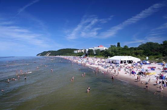 Misdroy, gesegnet mit weißem Strand und mildem Klima, weil das Steilufer die rauen Seewinde abschirmt, ist im Sommer allerdings arg überlaufen.