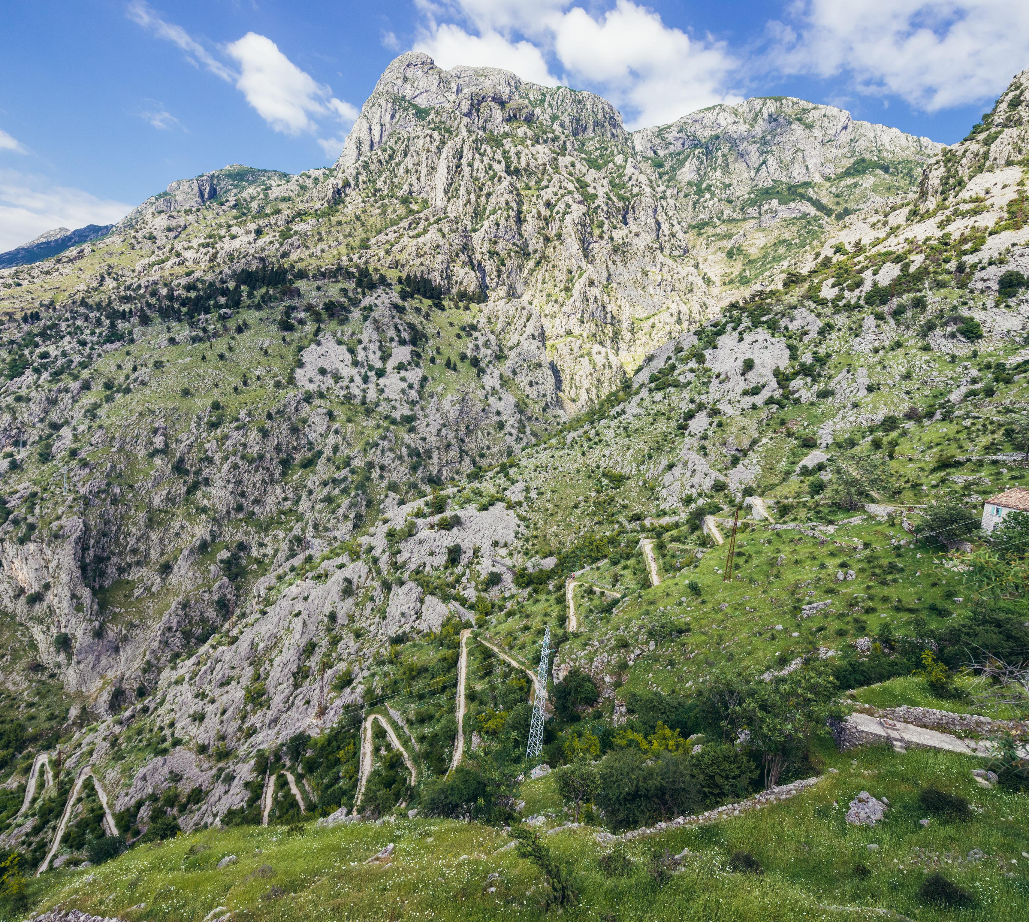 Aus Kotor nimmst du erst die P22 nach Süden, die auch nach Budva führt, hinter dem Dorf Škaljari dann aber die Bergstraße nach links. Auf der Landkarte sieht die hier beginnende Straße P1 mit ihren dichten Serpentinen Furcht einflößend aus. In Wirklichkeit gibt es zwar recht enge Kurven und deutliche Steigungen, aber mit etwas Vorsicht und Aufmerksamkeit ist alles bestens zu befahren. Nicht immer ist die Straße breit genug für zwei sich entgegenkommende Fahrzeuge, aber es gibt zahlreiche Ausweichbuchten, und bisher musste noch niemand im Rückwärtsgang nach Kotor zurückkehren.