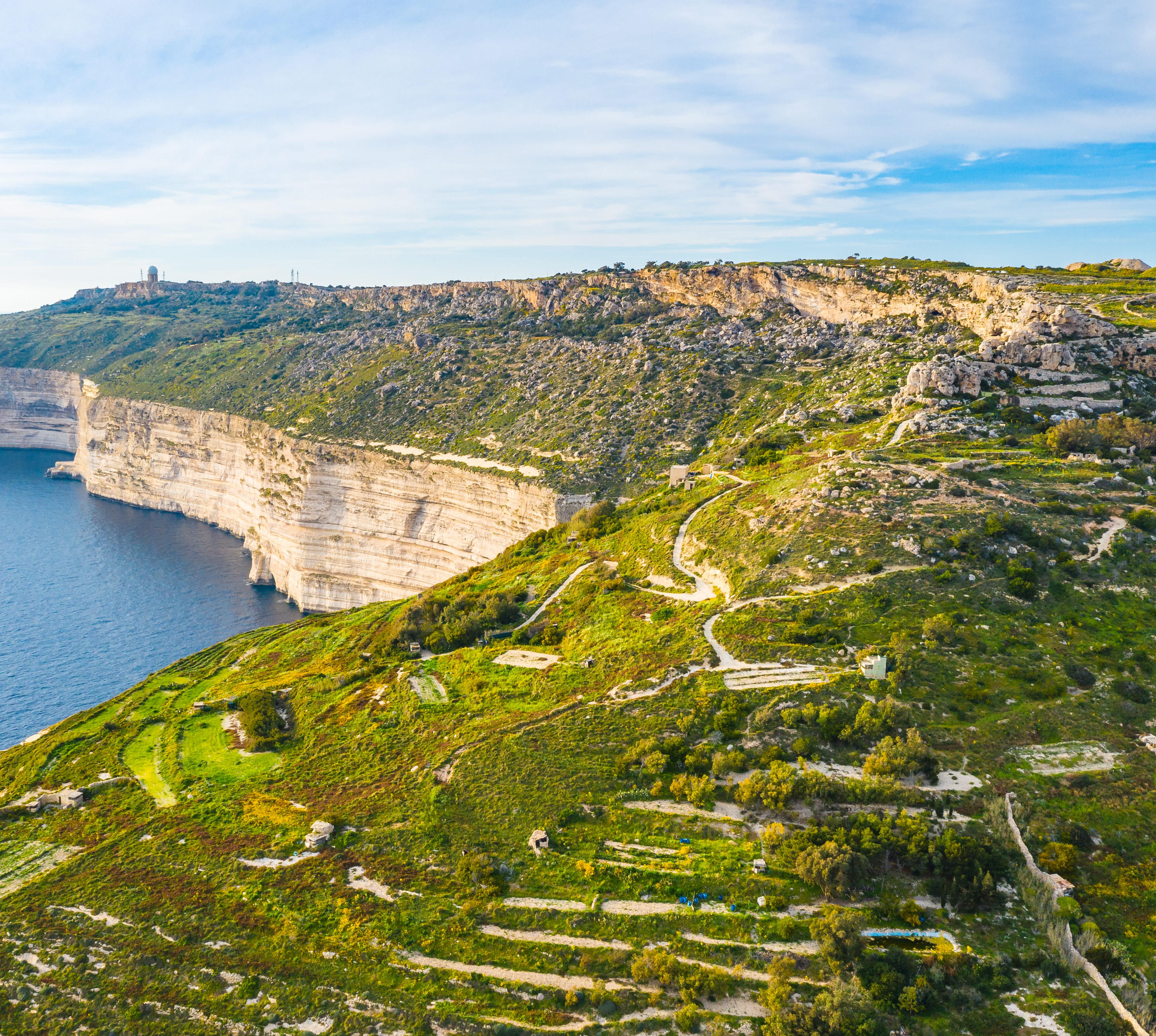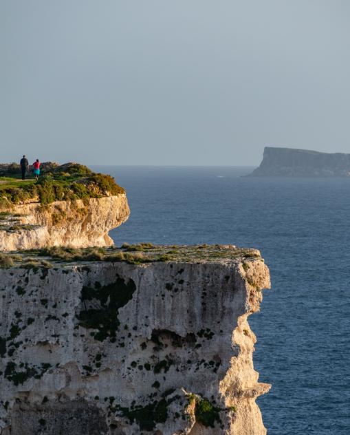 Eine faszinierende Landschaft: Auf mehrere Kilometer Länge fallen die Klippen von Dingli über 200 m hoch fast direkt ins Meer ab. Dicht oberhalb des Wassers wird der Abwärtstrend auf weite Strecken jedoch durchbrochen. Da hat sich eine breite Terrasse gebildet, die früher intensiv für die Landwirtschaft genutzt wurde. Hinunter darf man nicht, denn die Grundstücke sind privat und werden leider von Maltas Vogelmördern geschätzt – optisch aber ist die Steilküste ein Highlight. Am obersten Klippenrand entlang führt eine schmale Straße, stehen viele Bänke, eine kleine Kapelle und Radarkuppen der maltesischen Flugsicherung – sonst nichts. Und auch inseleinwärts hält das nächstgelegene Dorf, Dingli, gebührenden Abstand zur puren Natur. Wer wandern möchte, kann auch mit dem Linienbus kommen und entlang der Steilküste gehen, dann über die Clapham Junction und die Buskett Gardens nach Rabat. Eine längere Einkehr wert ist das exzellente The Cliffs. Es bietet Kaninchenrouladen und als innovativen Clou eine „One Kilometer Platter“. Alles, was auf dem bunt gemischten Teller liegt, stammt aus einem Umkreis von einem Kilometer. Das Gebäude ist hochgradig energieeffizient.