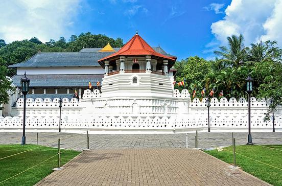 Dieser Tempel hütet das kostbarste Heiligtum Sri Lankas, einen Eckzahn Buddhas. Die Reliquie gilt den Singhalesen auch als Symbol ihrer Macht. Eine derartige Bedeutung sieht man dem verschachtelten Gebäude zunächst nicht an: Es wirkt wie eine Mischung aus Palast und Kloster. In seiner heutigen Form stammt das Gebäude aus dem 18.Jh. Der markante achteckige Turm wurde sogar erst zu Beginn des 19.Jhs. angefügt. Er enthält eine Bibliothek mit alten Palmblattmanuskripten. So wenig pompös der Tempel von außen wirkt, so üppig ist er in seinem Innern ausgestattet: mit Wandmalereien, wunderschön verzierten Türen und anderen schmückenden Elementen. Vor dem Schrein mit der Zahnreliquie im Obergeschoss legen die Gläubigen zu allen Tageszeiten Blumen nieder. Der Strom der Besucher schwillt dreimal am Tag besonders an. Dann werden die silberbeschlagenen Türen zum Allerheiligsten unter Trommelwirbel für jeweils etwa eine Stunde geöffnet. Der Zahn wurde der Überlieferung zufolge nach dem Tod Buddhas (um 489 v. Chr.) aus der Asche des Erleuchteten geborgen. Einmal im Jahr, zum Esala-Vollmond (Juli/Aug.), wird mit einem elftägigen Fest der Zahnreliquie gehuldigt. Dann finden allnächtlich spektakuläre Prozessionen statt. Die täglichen, etwa einstündigen Tempelzeremonien beginnen um 5.30, 9.30 und 18.30 Uhr. Die erste Zeremonie ist weitgehend touristenfrei.