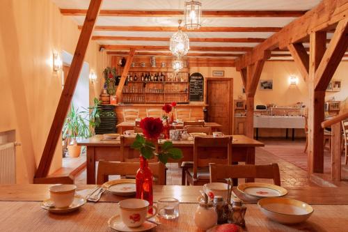 Die Gäste des Forsthaus können im ländlich eingerichteten Speisesaal mit Terrasse frühstücken. Ein gemeinschaftlich genutzter Kühlschrank sowie eine Tee- und Kaffeemaschine stehen in der Lounge zur Verfügung. Sie ist zugleich auch Leseraum.