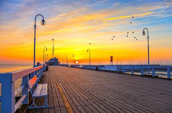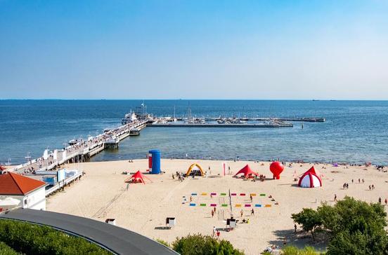 Sopot hat den Glanz eines mondänen Kurorts zurückerobert. Toll ist der weiße, feinsandige Strand, an dem du kilometerweit laufen kannst: Gen Norden kommst du nach 3 km zu den Adlerklippen (Orłowo), die senkrecht aus dem Meer ragen. Doch auch im Ort ist viel zu sehen: in der Nähe der Mole z.B. das Kurhaus (Dom Zdrojowy) mit Touristinfo und Trinkbrunnen, wo du kostenlos Heilwasser probieren kannst. Hier befinden sich auch die Staatliche Kunstgalerie und mit Mineralwasser gefüllte Badepools. Die Mole ist mit 516 m die längste hölzerne Seebrücke Europas. Von hier starten Ausflugsschiffe nach Danzig und auf die Halbinsel Hela. Von der Mole gelangt man über die Promenade (Bohaterów Monte Cassino) in die Stadt. Die Fußgängerzone mit Galerien und Cafés ist meist gut besucht. Abseits vom Trubel bietet das Strandhotel Marriott Sopot in skandinavischem Ambiente Wellness vom Feinsten. Das Haus liegt am Strand, die Architektur sorgt mit Holz und Naturstein für Entspannung.